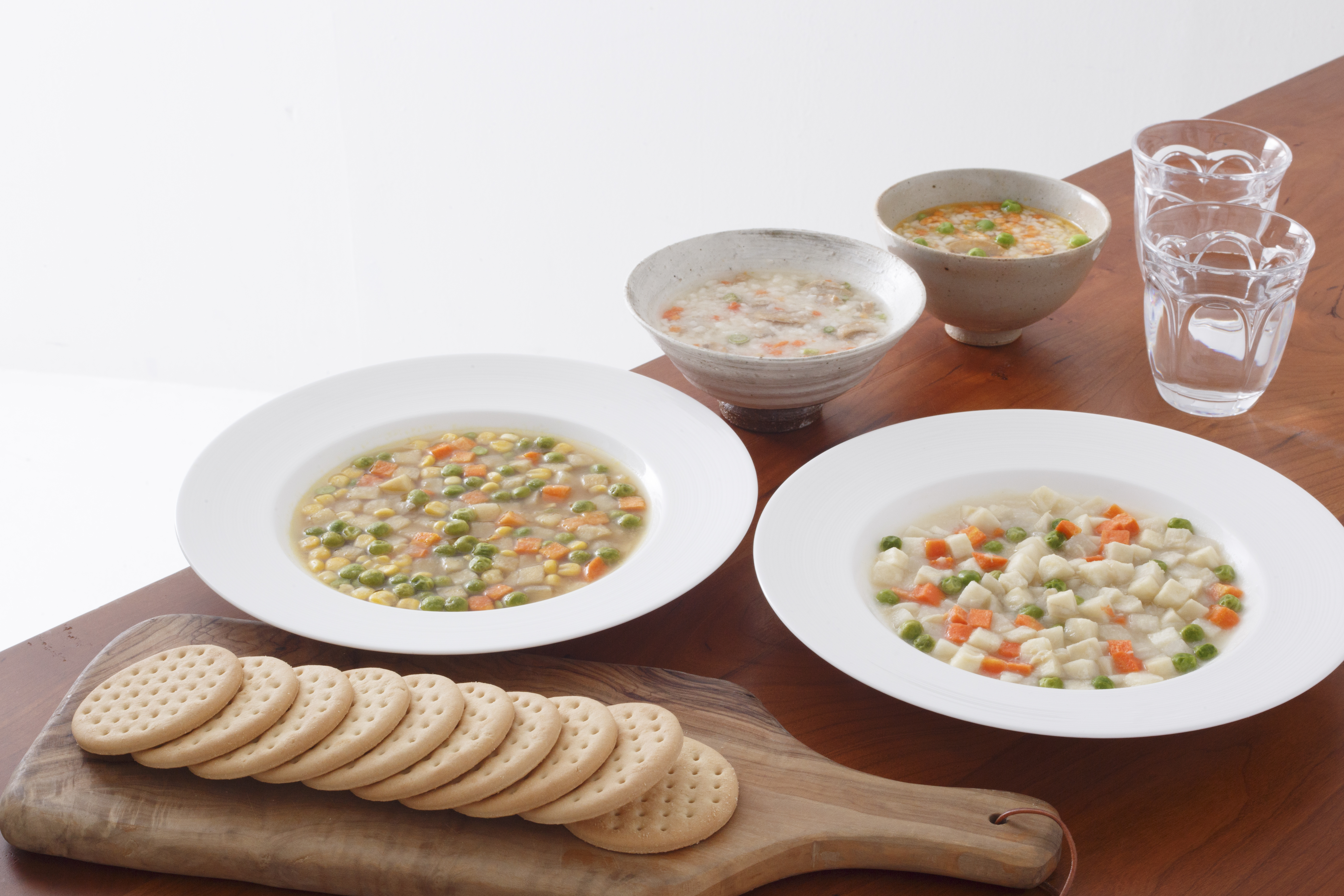 クラッカー2缶、チキンシチュー1缶、野菜シチュー1缶、洋風とり雑炊1缶、洋風えび雑炊1缶